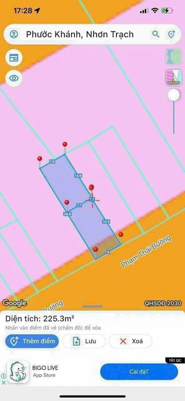 Bán đất Mặt tiền đường phạm thái Bường Phước Khánh Nhơn Trạch, ngay khu dân cư Diện tích 223m có 85m thổ cư (trọn 2 sổ) Giá bán nhanh 2 tỷ 600 triệu